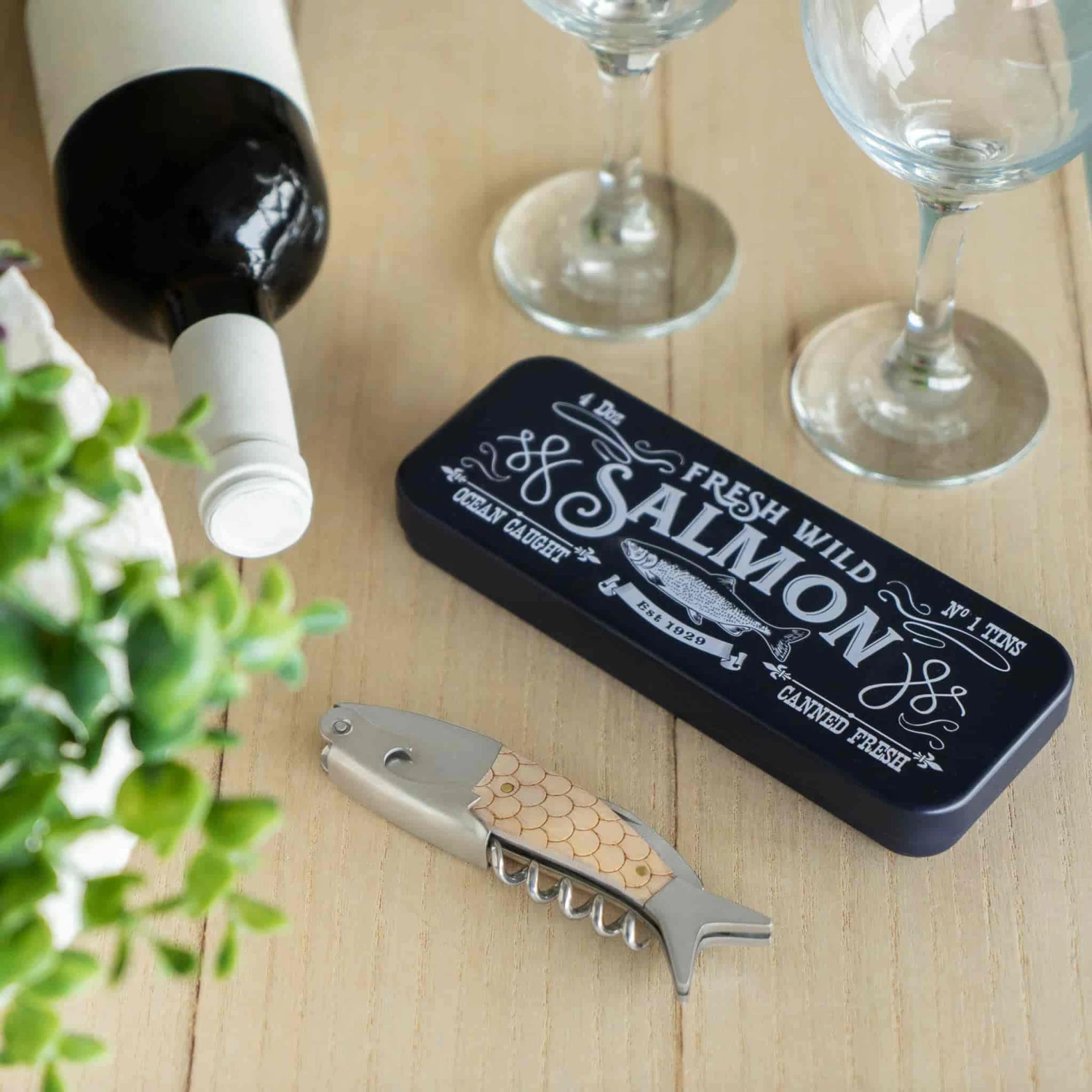 This wild salmon-inspired corkscrew will add a touch of nautical whimsy to your dinner table. Made from stainless steel, it has a distinctive fish shape, complete with forked tail and pale orange scales. Use it to remove the cork from your favourite wine or to open bottles of cold beer.