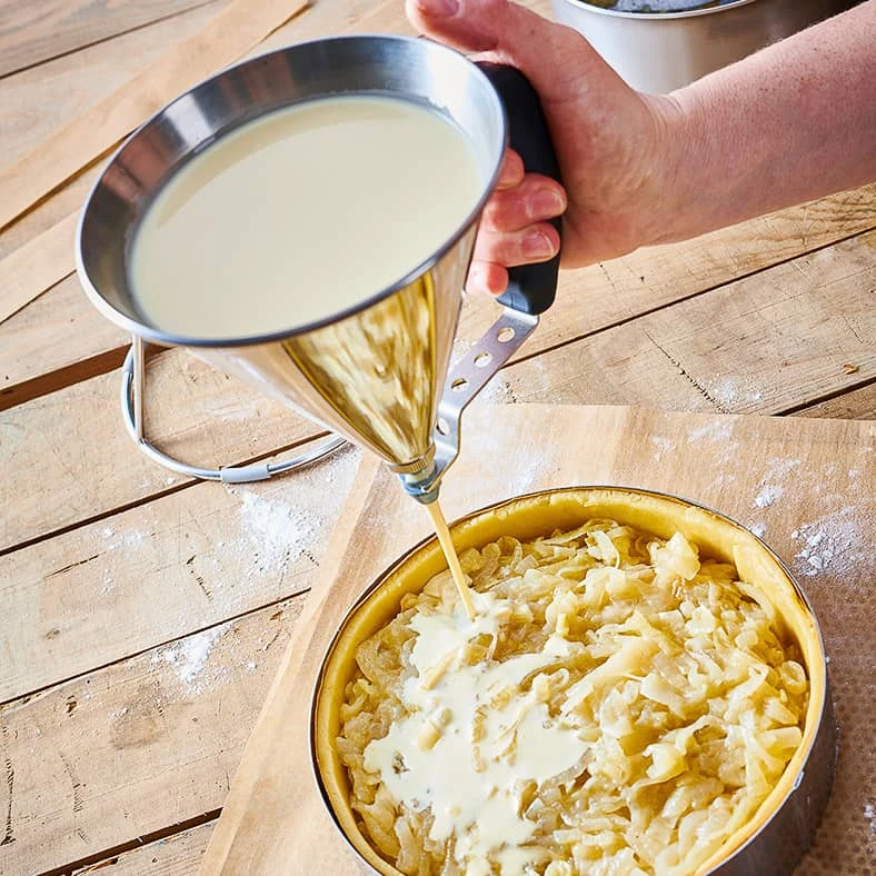 Pour the cake batter into the funnel, then press the trigger on the handle to release a stream of batter into a mould or tray. The flow stops as soon as you release the trigger for precise control and fewer drips.