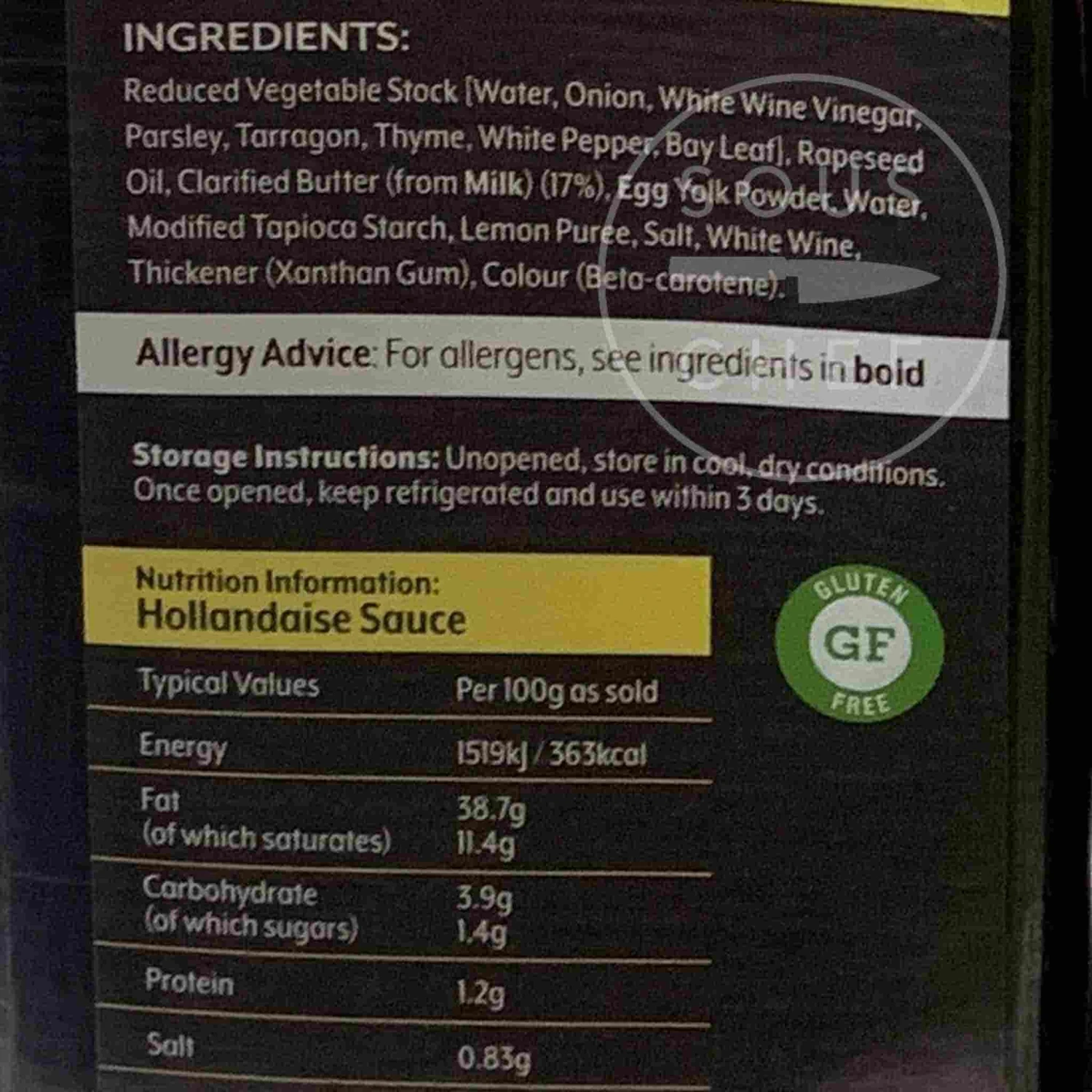 Ingredients: Reduced vegetable stock (water, onion, white wine vinegar, parsley, tarragon, thyme, white pepper, bay leaf), rapeseed oil, clarified butter (from milk) (17%), egg yolk powder, water, modified tapioca starch, lemon puree, salt, white wine, thickener xanthan gum, colour beta-carotene.