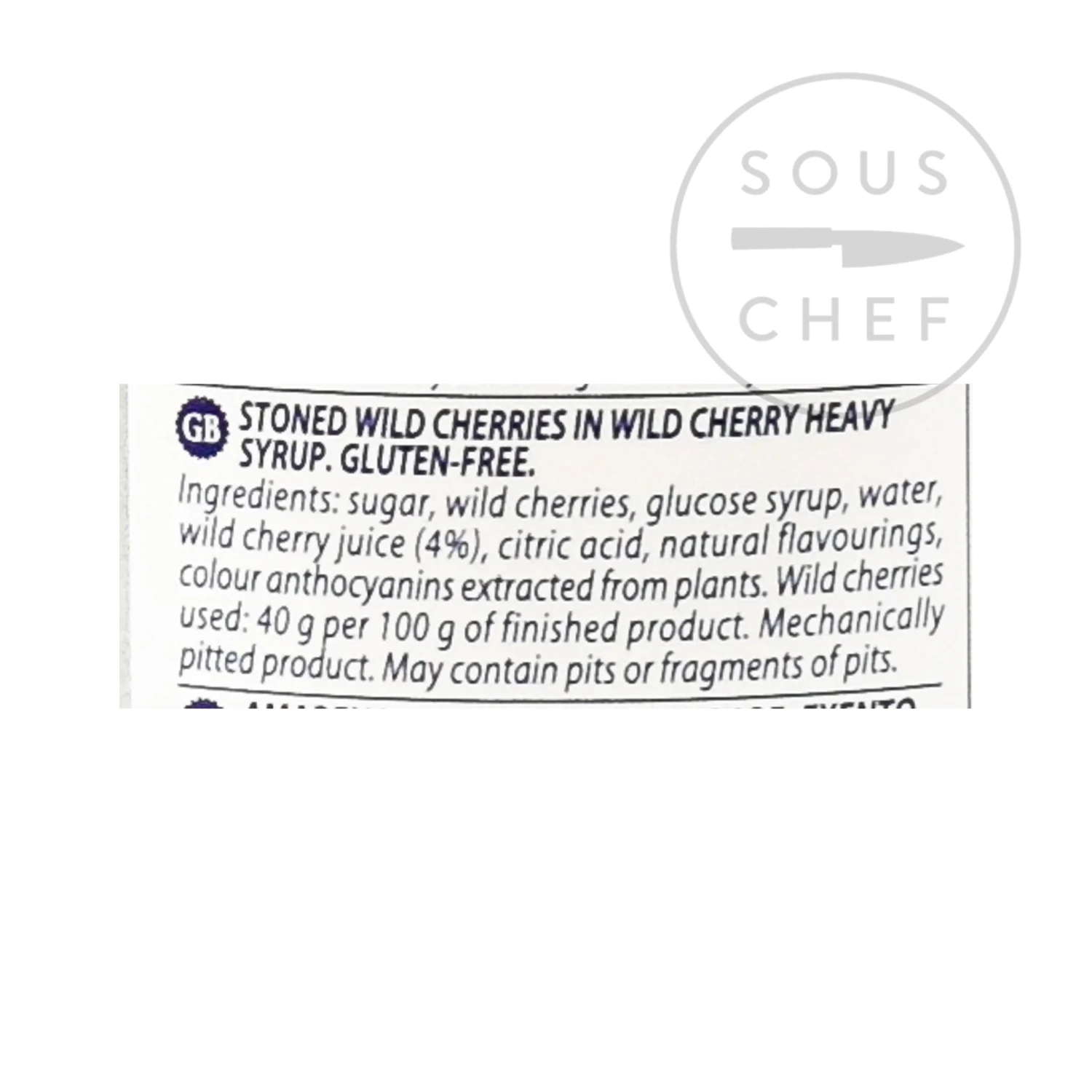 Ingredients: sugar, wild cherries, glucose syrup, water, wild cherry juice (4%), citric acid, natural flavourings, colour: anthocyanins extracted from plants. Wild cherries used: 40g per 100g of finished product. Mechanically pitted product. May contain pits or fragments of pits.
