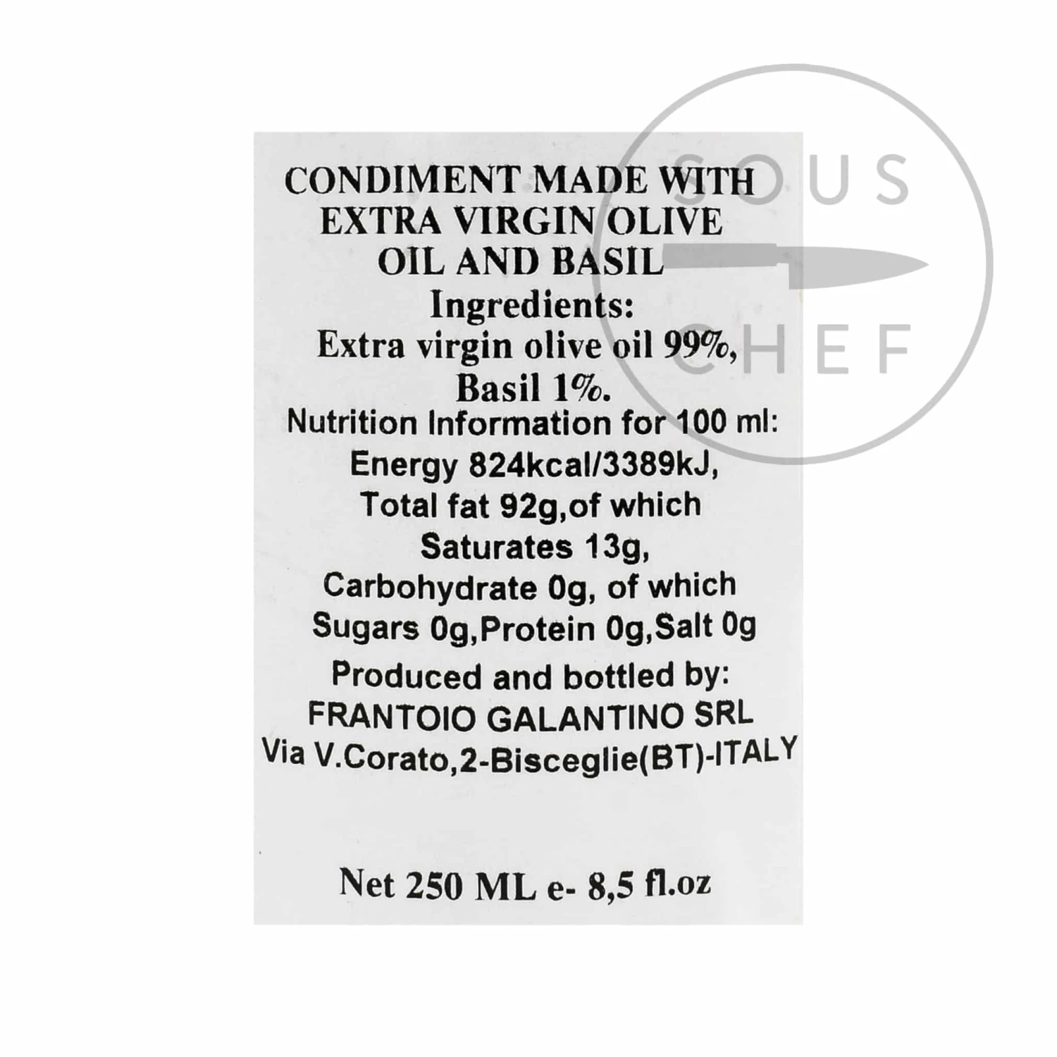 Ingredients: extra virgin olive oil (99%), basil (1%).