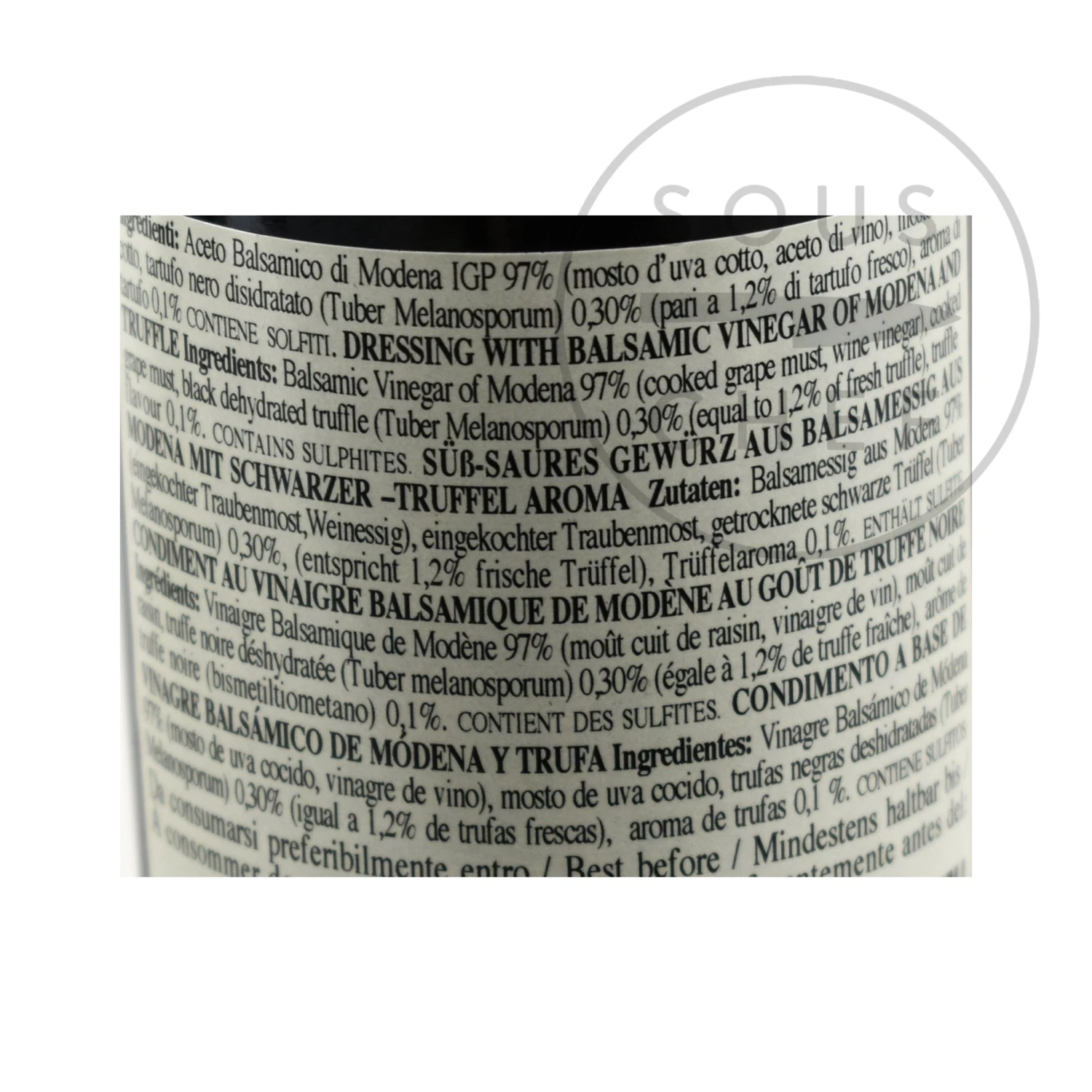Ingredients: Raspberry vinegar: Balsamic vinegar of Modena 97% (cooked grape must, wine vinegar), cooked grape must, raspberry juice 2%, flavour. Fig vinegar: Balsamic vinegar of Modena 97% (cooked grape must, wine vinegar), cooked grape must, fig puree 2%, flavour. Black truffle vinegar: Balsamic vinegar of Modena 97% (cooked grape must, wine vinegar), cooked grape must, black dehydrated truffle (Tuber Melanosporum) 0.30% (equal to 1.2% of fresh truffle), truffle flavour 0.1%. Contains sulphites.