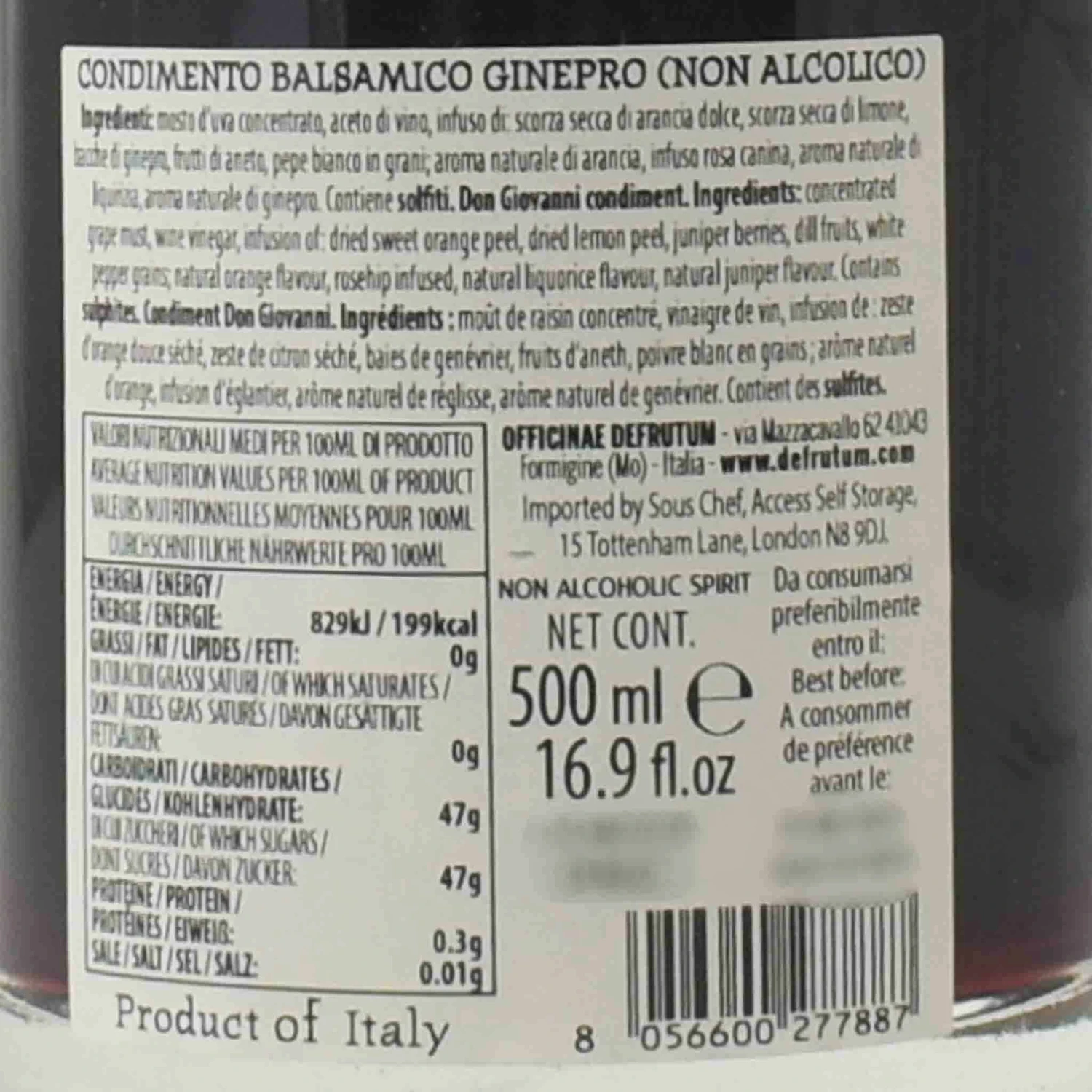 Ingredients: Concentrated grape must, wine vinegar, infusion of: dried sweet orange peel, dried lemon peel, juniper berries, dill fruits, white pepper grains; natural orange flavour, rosehip infused, natural liquorice flavour, natural juniper flavour. Contains sulfites.