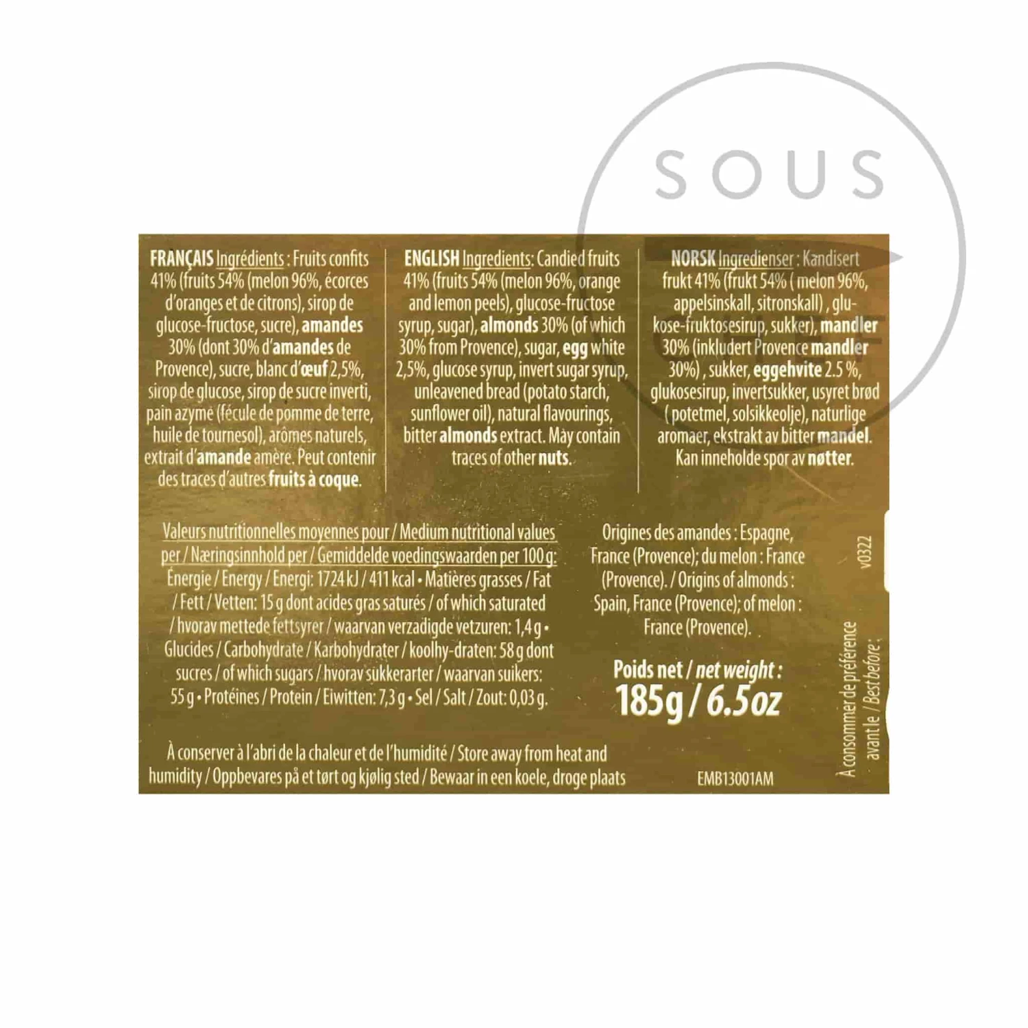 Ingredients: candied fruits 41% (fruits 54% [melon 96%, orange and lemon peels], glucose-fructose syrup, sugar), almonds 30% (of which 30% from Provence), sugar, egg white 2,5%, glucose syrup, invert sugar syrup, unleavened bread (potato starch, sunflower oil), natural flavourings, bitter almonds extract.