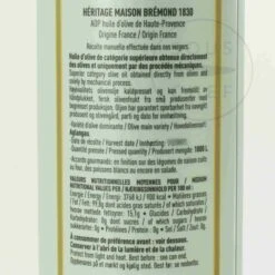 Maison Bremond’s heritage extra virgin oil has a ripe and fruity flavour with a hint of floral sweetness. It is made from olives that are harvested by hand from the orchards of Monfort in Haute-Provence. The olive grove is made up of almost 1,500 trees, with olives of the Aglandau, Frantoio and Bouteillan varieties.