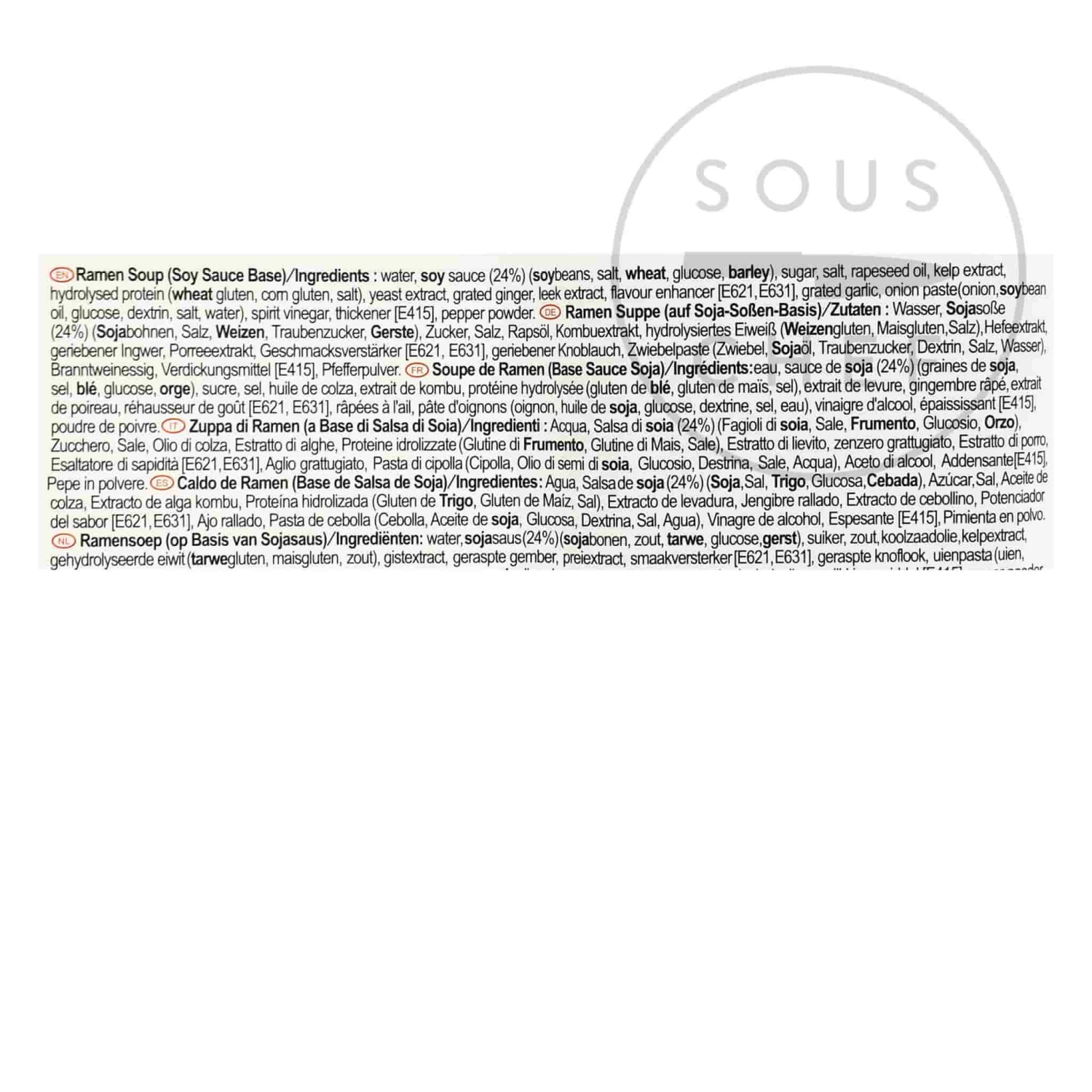 Ingredients: Water, soy sauce (24%) [soybeans, salt, wheat, glucose, barley (gluten)], sugar, salt, rapeseed oil, kelp extract, hydrolysed protein (wheat gluten, corn gluten, salt), yeast extract, grated ginger, leek extract, flavour enhancer [e621, e631], grated garlic, onion paste (onion, soybean oil, glucose, dextrin, salt, water), spirit vinegar, thickener [e415], pepper powder.