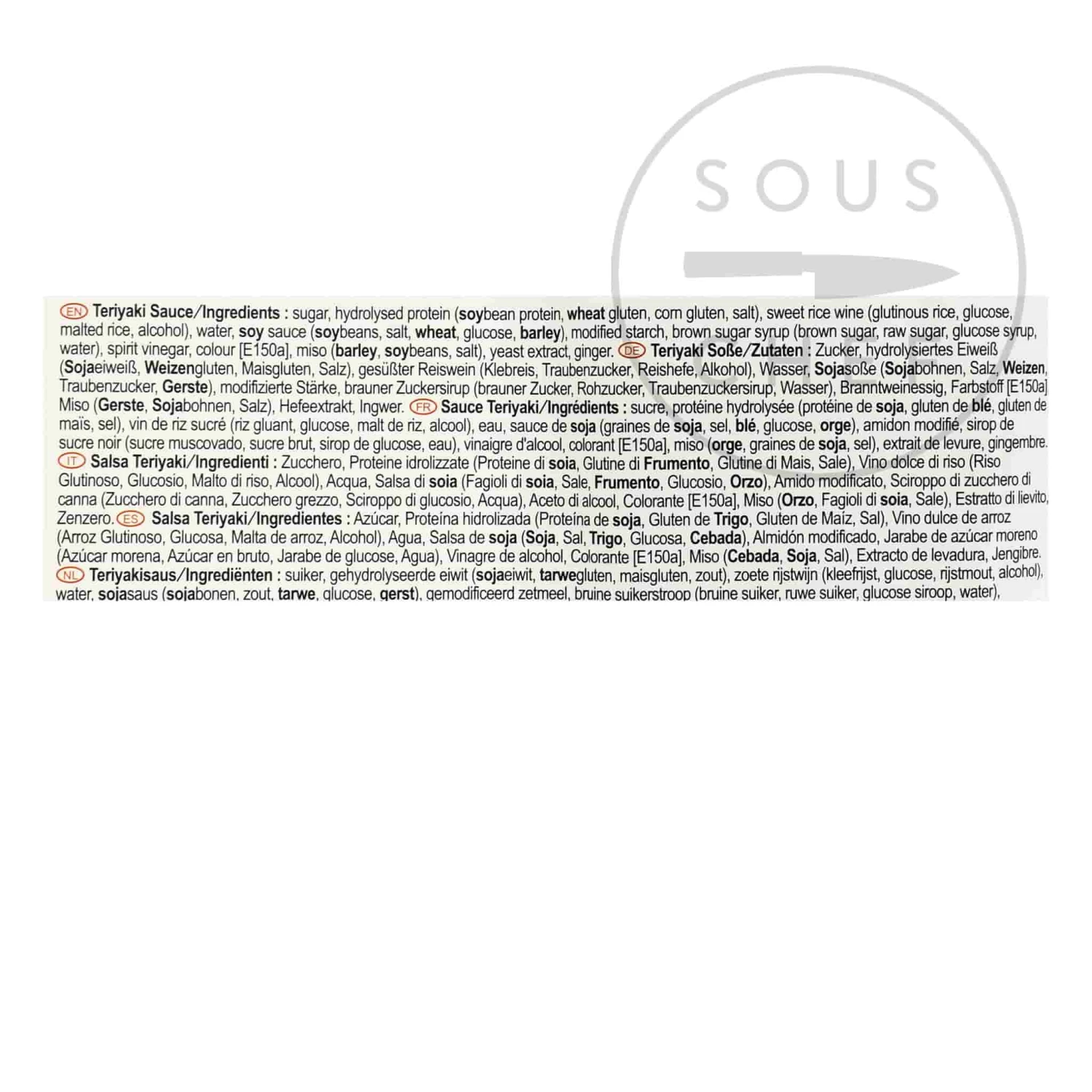 Ingredients: Sugar, hydrolysed protein (soybean protein, wheat gluten, corn gluten, salt), sweet rice wine (glutinous rice, glucose, malted rice, alcohol), water, soy sauce (soybeans, salt, wheat (gluten), glucose, barley (gluten)), thickener: modified starch, brown sugar syrup (brown sugar, raw sugar, glucose syrup, water), spirit vinegar, colour [E150a], miso (barley (gluten), soybeans, salt), yeast extract, ginger