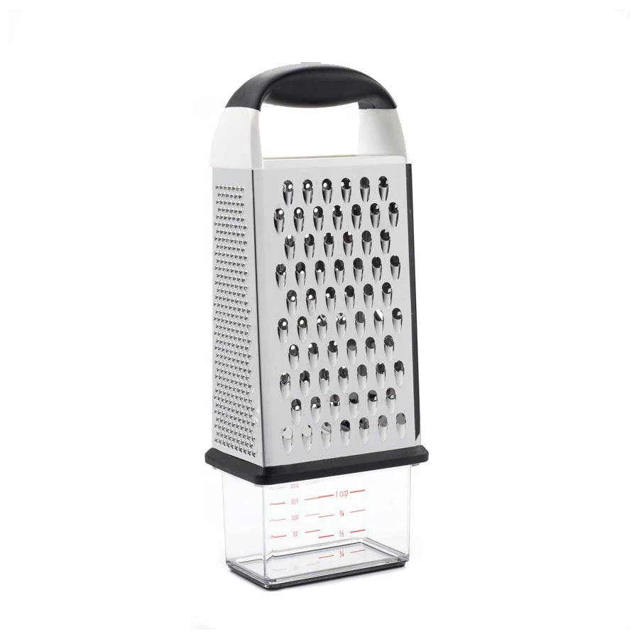The classic box grater gets an OXO Good Grips makeover. Featuring the 4 familiar grating surfaces – coarse, fine, slice and nutmeg – it has a sturdy non-slip base and a large, easy-grip handle. It also comes with a removable storage container. Clip it onto the base to catch and store freshly grated ingredients.