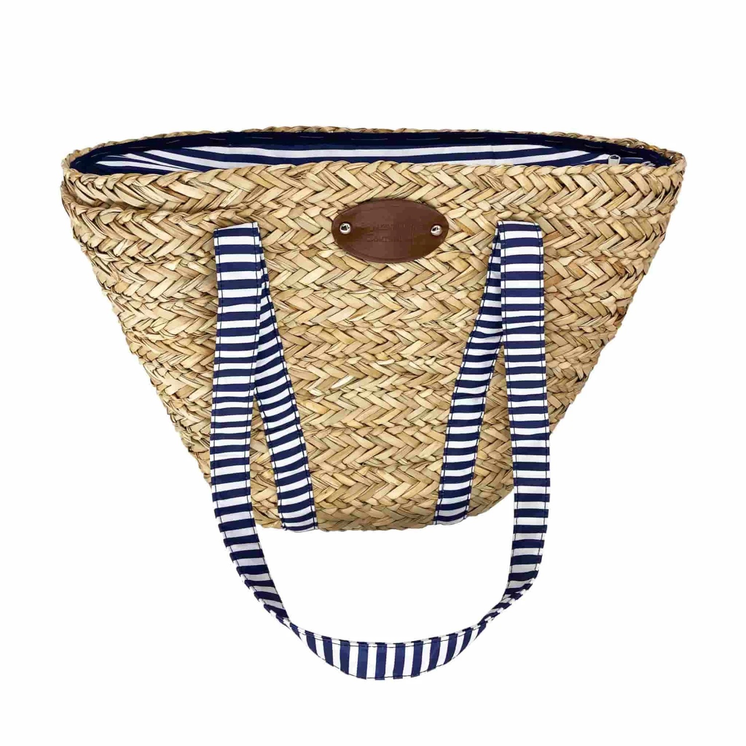The Sac de Plage picnic tote in Riviera blue is an elegant way to carry food and drink to the beach. The spacious raffia bag has blue and white striped lining and an insulated compartment to keep food and drink cool. Inside, you’ll find four plates, glasses, a corkscrew and a set of bamboo cutlery in a smart blue case.