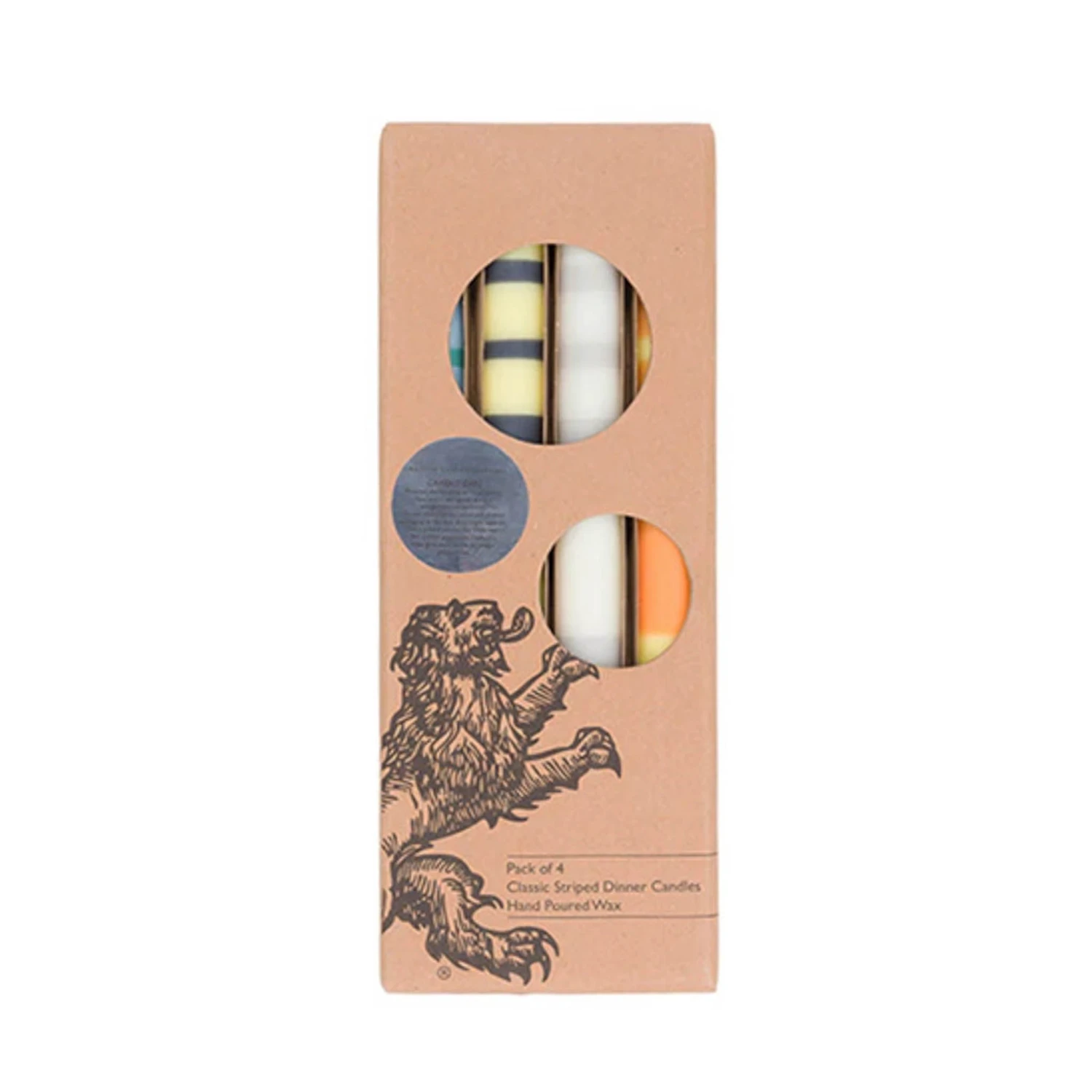 This set of four striped candles will add a bold splash of colour to any dinner table. Made with eco colour dyes in shades of yellow, blue and green, they are ideal for dinner parties and al fresco gatherings. Pair them with napkins and tableware in matching or contrasting colours to suit your mood.