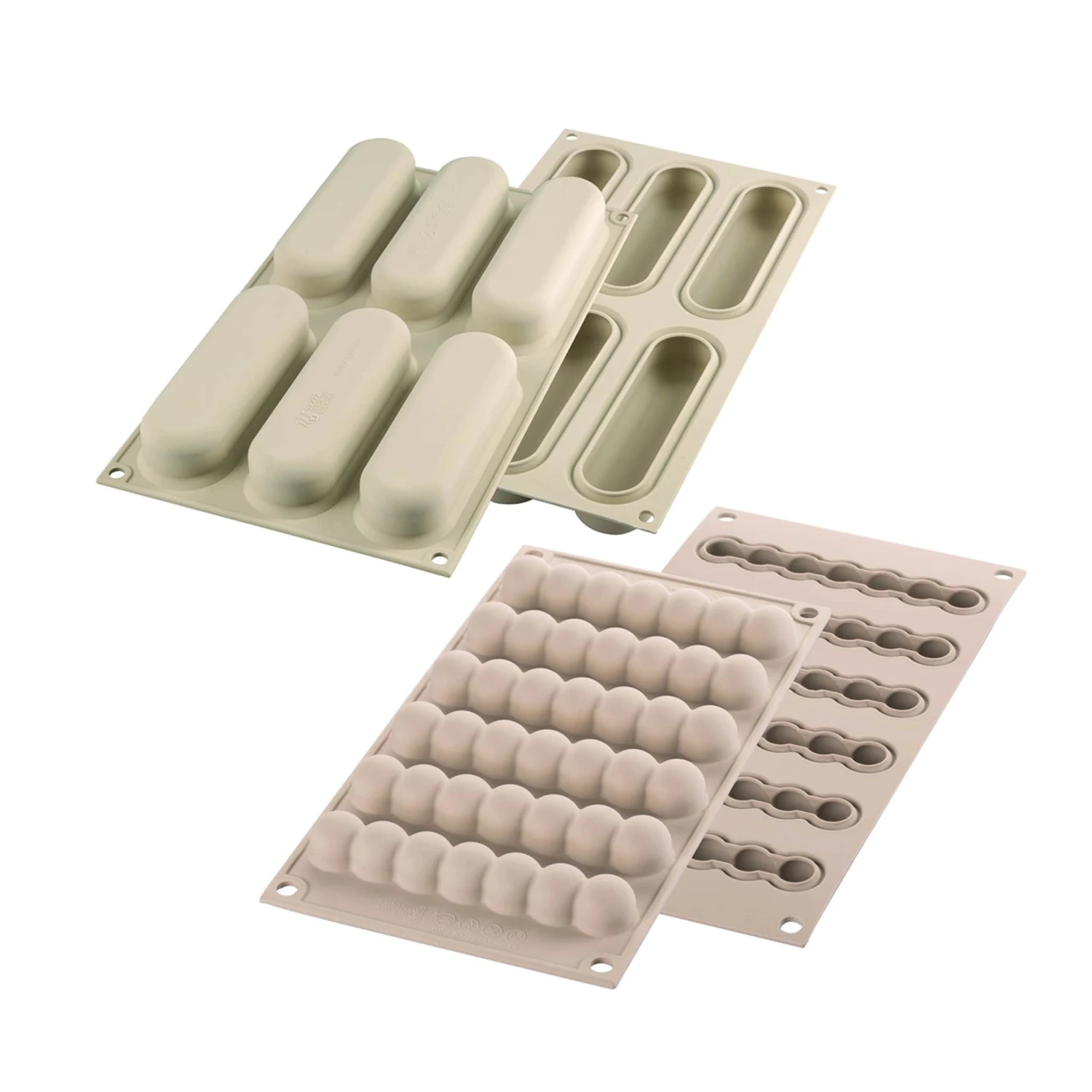 Both moulds feature a thoughtfully designed internal border that gives your éclairs a slightly rounded base.Â
