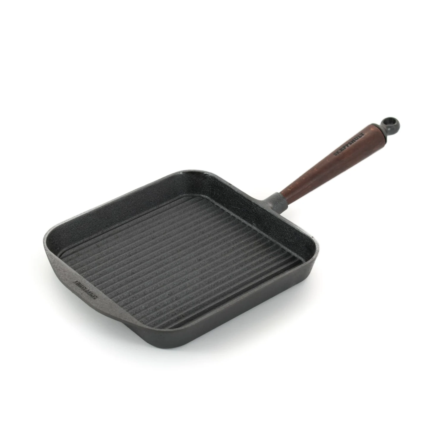 Use the Skeppshult traditional cast iron square grill pan for griddling fish, searing meat, and giving veg beautiful dark char marks. The high ridges are exactly what you want for making sharp, distinct grill lines that give food a dramatic finish. Plus the raised grill ridges mean fat drains away from the food, for proper grilling as opposed to frying.