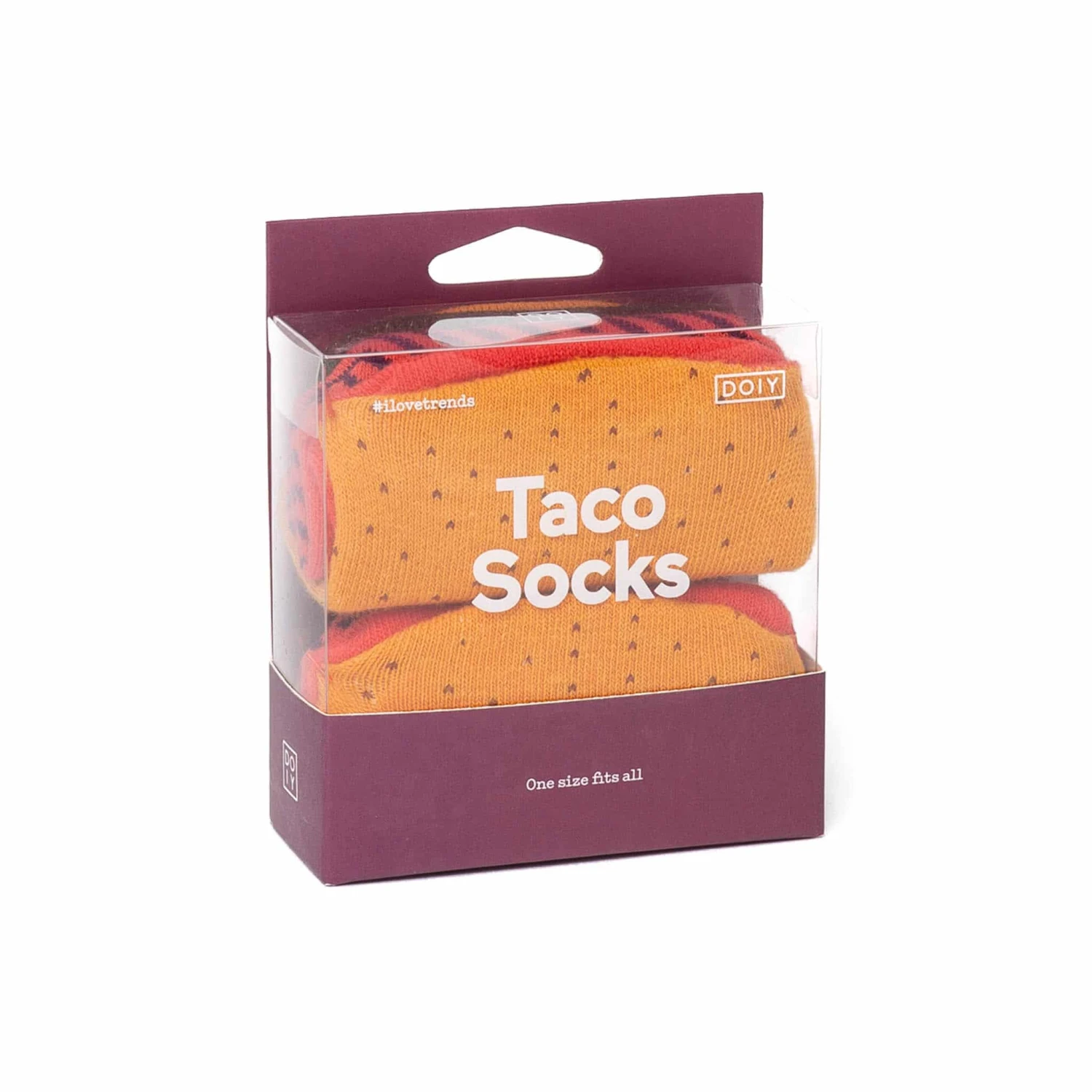 Gift these taco socks to delight any Mexican food lovers in your life! These quirky and colourful socks are folded up to resemble crunchy tacos with a spicy meat filling. When they are worn, they have a bright block colour pattern of each element of the fresh taco.Â