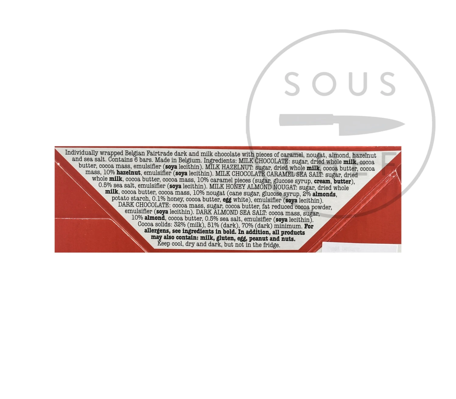 Ingredients: Milk chocolate: sugar, dried whole milk, cocoa butter, cocoa mass, emulsifier (soya lecithin). Milk hazelnut: sugar, dried whole milk, cocoa butter, cocoa mass, 10% hazelnut, emulsifier (soya lecithin). Milk chocolate caramel sea salt: sugar, dried whole milk, cocoa butter, cocoa mass, 10% caramel pieces (sugar, glucose syrup, cream, butter), 0.5% sea salt, emulsifier (soya lecithin). Milk honey almond nougat: sugar, dried whole milk, cocoa butter, cocoa mass, 10% nougat (cane sugar, glucose syrup, 2% almonds, potato starch, 0.1% honey, cocoa butter, egg white), emulsifier (soya lecithin). Dark chocolate: cocoa mass, sugar, cocoa butter, fat reduced cocoa powder, emulsifier (soya lecithin). Dark almond sea salt: cocoa mass, sugar, 10% almond, cocoa butter, 0.5% sea salt, emulsifier (soya lecithin).Â