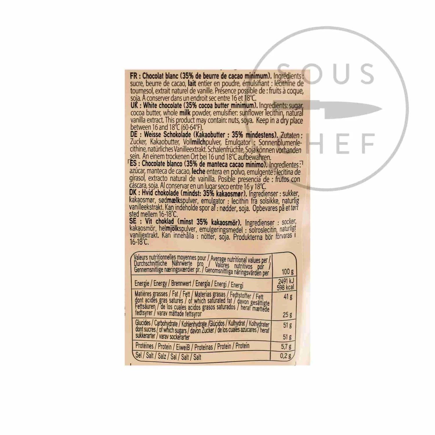 Valrhona ivoire contains a minimum of 35% cocoa butter which helps the chocolate melt and flow in baking, and gives the white chocolate its creamy taste. The individually moulded chocolate chips are easy to weigh out and very quick to melt with their trademark Valrhona feves or bean shape.